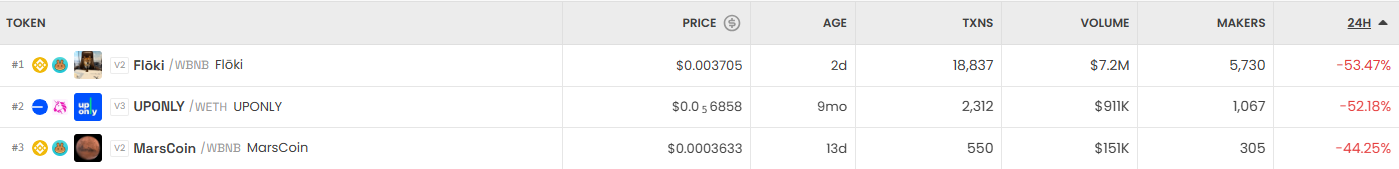반면 가장 크게 하락한 거래쌍은 Floki/WBNB(Floki)로, 53.47% 하락하며 0.003705달러에 거래됐다. 이어 UPONLY/WETH(UPONLY)가 52.18%, MarsCoin/WBNB(MarsCoin)가 44.25% 떨어졌다.