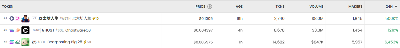 하루 동안 DEX에서 가장 크게 오른 거래쌍은 以太坊人生/WETH(以太坊人生)으로, 500% 급등하며 0.1005달러에 거래됐다. 이어 GHOST/SOL(GhostwareOS)이 121% 상승하며 0.004397달러를 기록했고, 25/SOL(Bearposting Big 25)이 6,453% 오르며 0.005975달러에 거래됐다.