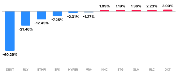 역프리미엄 구간 DENT(–60.29%)|RLY(–21.46%)|ETHFI(–12.45%)|SPK(–7.25%)|HYPER(–2.31%)