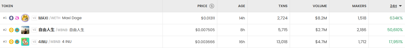 하루 동안 DEX에서 가장 크게 오른 거래쌍은 Maxi Doge/WETH(MAXI)로, 63만4000% 급등하며 0.01311달러에 거래됐다. 이어 自由人生/WBNB(自由人生)가 5만610% 상승하며 0.007505달러를 기록했고, 4 INU/WBNB(4INU)가 1만7951% 오르며 0.003666달러에 거래됐다.