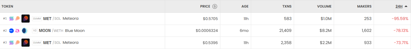반면 가장 크게 하락한 거래쌍은 Meteora/SOL(MET)로, 95.59% 하락하며 0.5705달러에 거래됐다. 이어 Blue Moon/WETH(MOON)가 78.13%, 또 다른 Meteora/SOL(MET) 풀이 73.71% 떨어졌다.