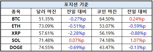 도지코인은 달러 마진 74.55%로 0.69%p 감소했고 코인 마진은 43.47%로 0.13%p 줄며 관망세를 보였다.