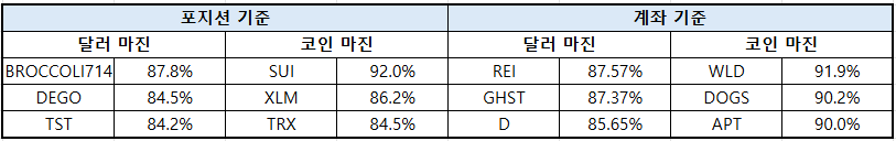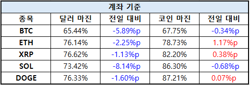 솔라나는 달러 마진 73.42%로 8.14%p 급감했으며 코인 마진은 86.30%로 0.68%p 하락했다. 도지코인은 달러 마진 76.33%로 1.60%p 줄었으나 코인 마진은 87.21%로 0.07%p 상승했다.