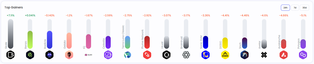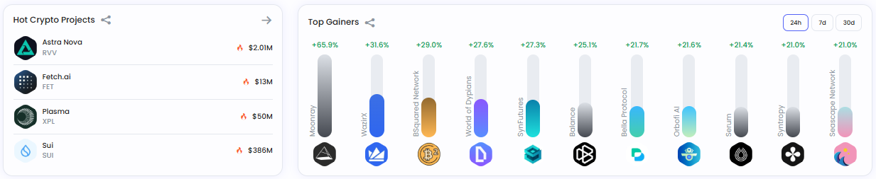 상승률 상위 프로젝트는 ▲문레이(+65.9%) ▲와지르엑스(+31.6%) ▲비스퀘어드 네트워크(+29.0%) ▲월드 오브 디피언스(+27.6%) ▲신퓨처스(+27.3%) ▲밸런스(+25.1%) 순으로 집계됐다.