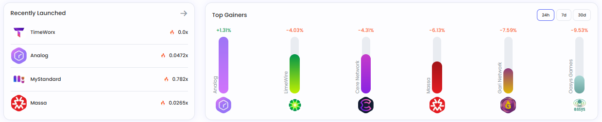 24시간 기준 변동률은 ▲아날로그(+1.31%) ▲라임와이어(–4.03%) ▲코레오네트워크(–4.31%) ▲마사(–6.13%) ▲걸프네트워크(–7.59%) ▲오아시스게임즈(–9.53%) 순으로 나타났다.