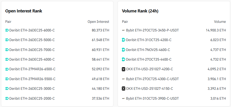 가장 많이 거래된 옵션 계약은 ▲3450달러 풋옵션(10월 27일, 바이비트) ▲4200달러 콜옵션(10월 31일) ▲4600달러 콜옵션(11월 7일) 순으로 집계됐다.