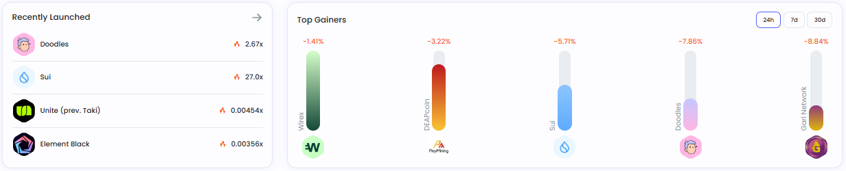 최근 해당 플랫폼에서 출시된 프로젝트는 ▲두들스(2.67배) ▲수이(27.0배) ▲유나이트(0.00454배) ▲엘리먼트 블랙(0.00356배) 등으로 확인됐다.