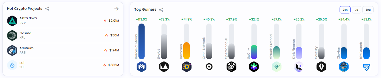 상승률 상위 프로젝트는 ▲히어로즈 오브 마비아(+113.0%) ▲IlluvArt(+73.3%) ▲Devomon(+41.9%) ▲옴니 네트워크(+40.3%) ▲오퍼레이터 AI(+37.9%) ▲업온리(+32.1%) ▲Virtude 프로토콜(+27.1%) ▲Klink 파이낸스(+25.2%) ▲코어스카이(+25.0%) ▲클레이튼(+24.4%) 순으로 나타났다.