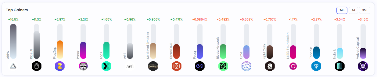 24시간 기준 변동률은 ▲와이렉스(–1.41%) ▲디앱코인(–3.22%) ▲수이(–5.71%) ▲두들스(–7.86%) ▲걸프네트워크(–8.84%) 순으로 나타났다.