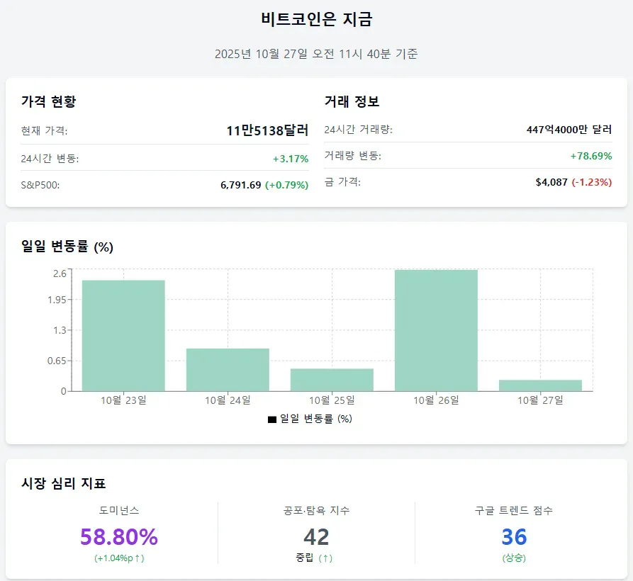일일 변동률 ▲10월 23일 +2.36% ▲24일 +0.91% ▲25일 +0.48% ▲26일 +2.58% ▲27일 +0.24%로, 변동성이 완만히 축소되는 가운데 상승세가 이어지고 있다.