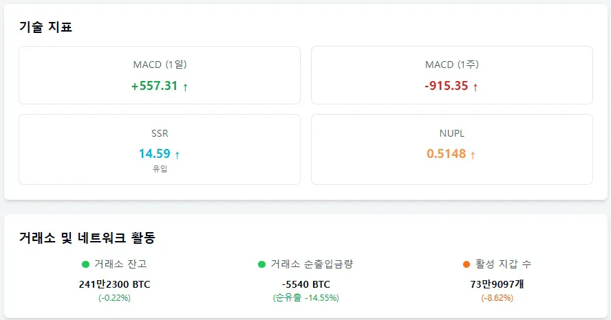 거래소 보유량 241만2300 BTC(–0.22%) 거래소 내 비트코인 보유량은 전일 대비 0.22% 감소했다. 매도 압력이 줄며 장기 보유세가 유지되고 있다.