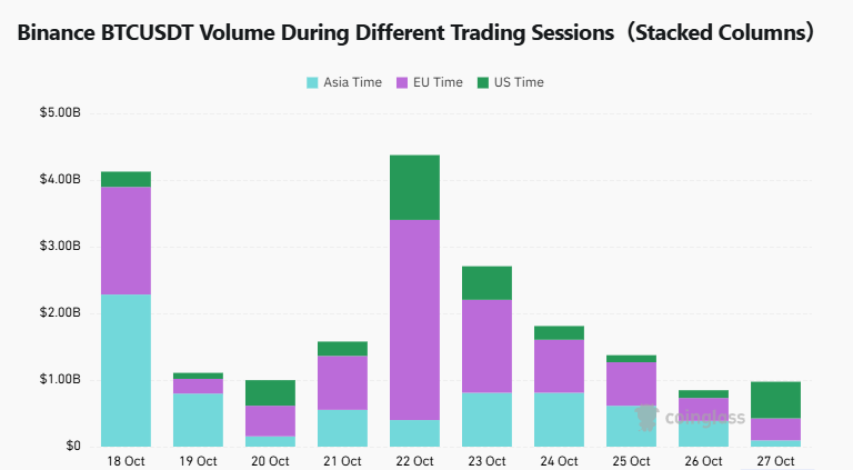 바이낸스 BTCUSDT 거래량은 아시아 시간대 9432만 달러, 유럽 시간대 3억3021만 달러, 미국 시간대 5억4951만 달러로 집계됐다.