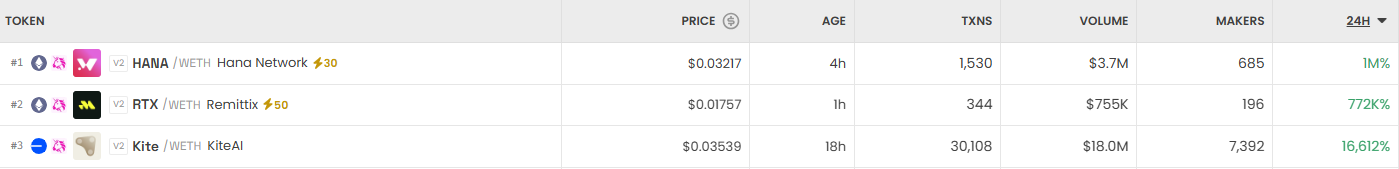 하루 동안 DEX에서 가장 크게 오른 거래쌍은 Kite/WETH(KiteAI)로, 16,612% 급등하며 0.03539달러에 거래됐다. 이어 RTX/WETH(Remittix)가 772% 상승하며 0.01757달러를 기록했고 HANA/WETH(Hana Network)가 11% 오르며 0.03217달러에 거래됐다.