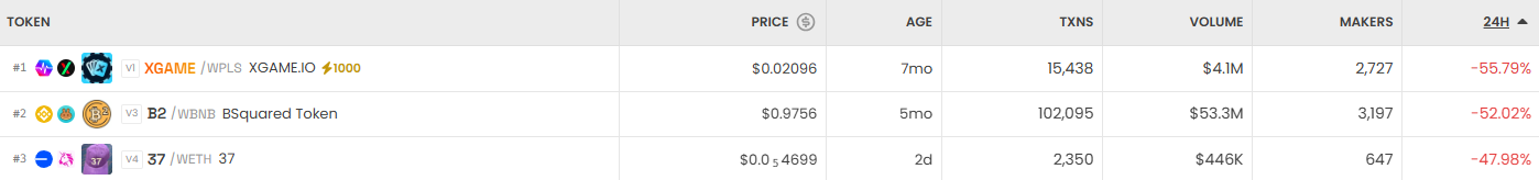 반면 가장 크게 하락한 거래쌍은 XGAME/WPLS(XGAME.IO)로, 55.79% 하락하며 0.02096달러에 거래됐다. 이어 B2/WBNB(BSquared Token)가 52.02%, 37/WETH(37)가 47.98% 떨어지며 약세를 보였다.
