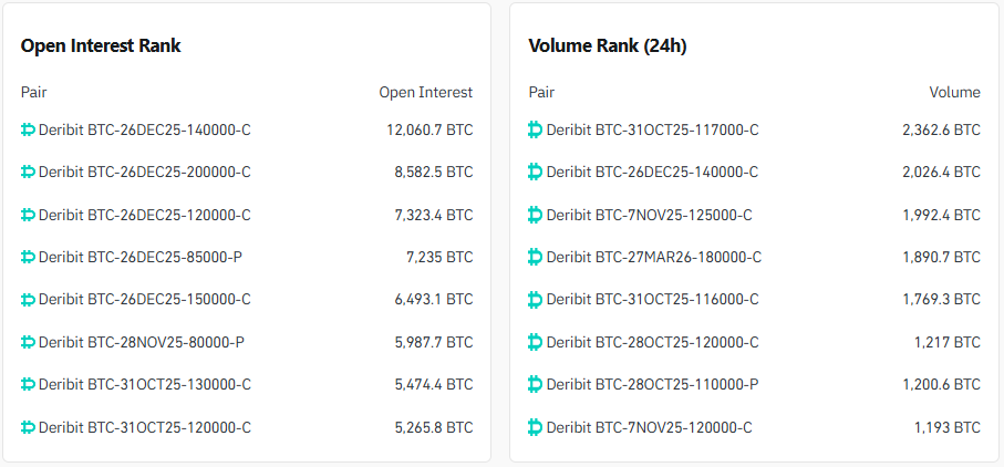 가장 많이 거래된 옵션 계약은 ▲11만7000달러 콜옵션(10월 31일) ▲14만 달러 콜옵션(12월 26일) ▲12만5000달러 콜옵션(11월 7일) 순으로 집계됐다.