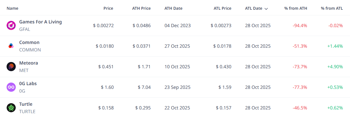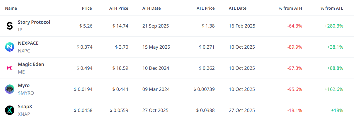 [편집자주] 암호화폐 시장은 하루 새 고점과 저점이 빠르게 바뀌는 고변동성 환경이다. 역대 최고가(ATH)와 역대 최저가(ATL) 경신 종목을 추적하면 강세와 약세 흐름을 조기에 포착할 수 있다. 크립토랭크 기준 시가총액 1000만 달러 이상 종목 중 하루 사이 고점 또는 저점을 경신한 주요 토큰을 정리하고 시가총액 상위 종목과 실시간 국내 인기 자산의 고점 대비 조정률을 함께 분석해 시장 회복 여력과 흐름을 진단한다.