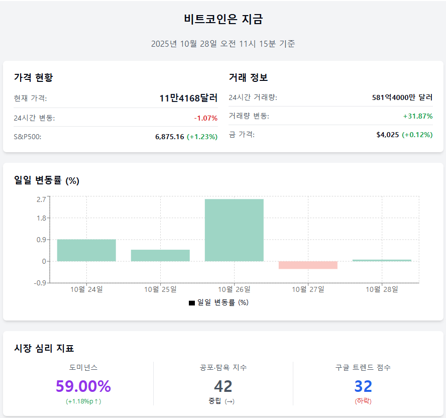 일일 변동률 0.07% ▲24일 +0.91% ▲25일 +0.48% ▲26일 +2.58% ▲27일 –0.32% ▲28일 +0.07%로, 급등 이후 변동성이 빠르게 축소되며 시장이 단기 횡보 국면에 진입한 모습이다.