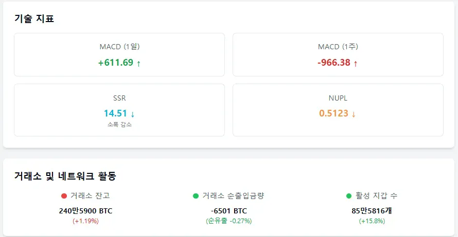 MACD 1일 +611.69 / 1주 –966.38 단기 MACD는 플러스 구간을 유지하며 완만한 상승 신호를 보였고 주간 MACD는 음수권을 유지하나 하락 폭이 완화되는 추세다.
