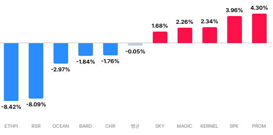 역프리미엄 구간 ETHFI(–8.42%)|RSR(–8.09%)|OCEAN(–2.97%)|BARD(–1.84%)|CHR(–1.76%)