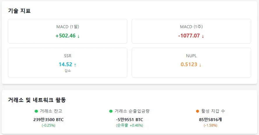 MACD 1일 +502.46 / 1주 –1077.07 단기 MACD는 플러스 구간을 유지하며 완만한 상승 신호를 보였다. 주간 MACD는 음수권을 유지하면서 하락 폭을 소폭 확대하는 추세다.