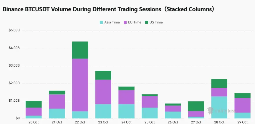 바이낸스 BTCUSDT 거래량은 아시아 시간대 3억2733만 달러, 유럽 시간대 8억3729만 달러, 미국 시간대 2억7414만 달러로 집계됐다.