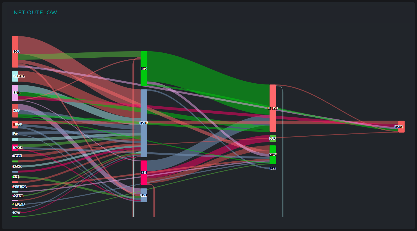 ▲USDC에서는 3740만 달러 상당이 ▲XRP(1210만 달러) ▲ETH(1030만 달러) ▲ADA(680만 달러) ▲USDT(370만 달러) ▲TRUMP(180만 달러) ▲TAO(130만 달러) ▲LINK(130만 달러)로 빠져나갔다.