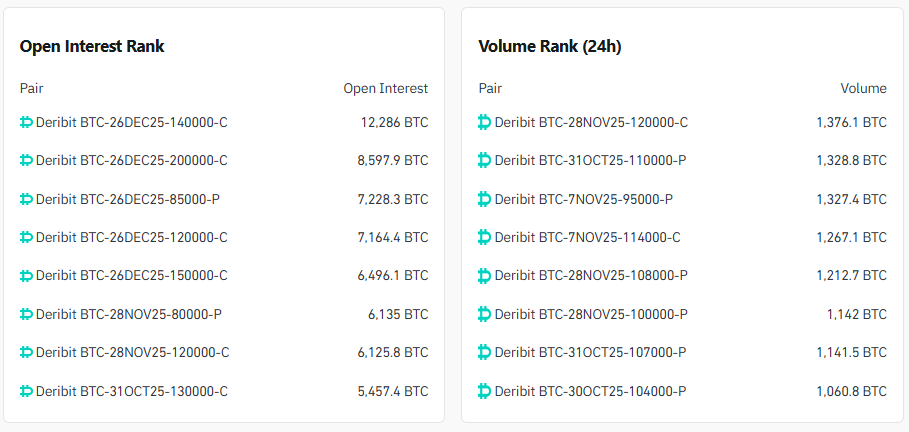 가장 많이 거래된 옵션 계약은 ▲12만 달러 콜옵션(11월 28일) ▲11만 달러 콜옵션(10월 31일) ▲9만5000달러 풋옵션(11월 7일) 순으로 나타났다.