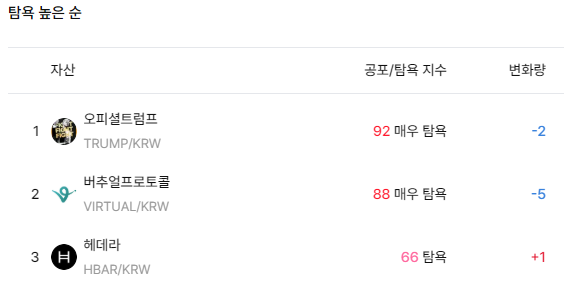 오피셜트럼프(TRUMP)가 30일 오전 업비트에서 전일 대비 0.81% 오른 12,460원에 거래되고 있다. 거래대금은 약 2,365억 원 규모로, 국내외 거래소 간 가격 차이가 2% 이내에서 유지되는 등 활발한 매매세가 이어지고 있다. 공포·탐욕 지수에서는 92포인트로 전체 디지털 자산 중 1위를 기록, ‘매우 탐욕’ 구간을 유지하며 단기 매수심리가 과열된 상태다.