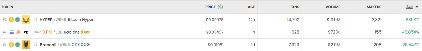 하루 동안 DEX에서 가장 크게 오른 거래쌍은 HYPER/WBNB(Bitcoin Hyper)로, 83만9000% 급등하며 0.02078달러에 거래됐다. 이어 XRM/SOL(Radiant)이 46,854% 상승하며 0.03457달러를 기록했고, Broccoli/WBNB(CZ’S DOG)가 26,547% 오르며 0.01081달러에 거래됐다.