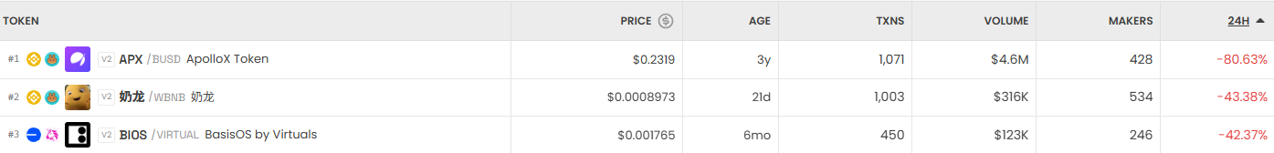반면 가장 크게 하락한 거래쌍은 APX/BUSD(ApolloX Token)으로, 80.63% 하락하며 0.2319달러에 거래됐다. 이어 奶龙/WBNB(奶龙)이 43.38%, BIOS/VIRTUAL(BasisOS by Virtuals)이 42.37% 떨어지며 약세를 보였다.