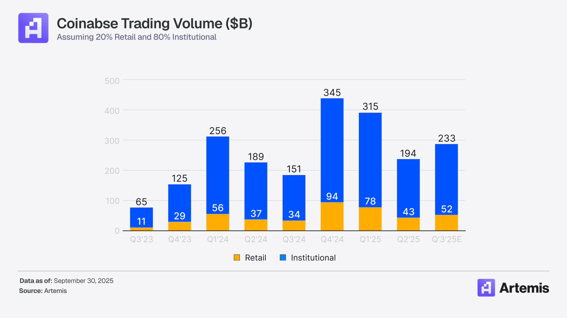 거래 부문은 여전히 코인베이스의 주요 수익원이다. 중앙화거래소(CEX) 활동을 기반으로 추정한 결과, 현물 거래량은 28% 증가해 2,850억 달러(약 403조 7,000억 원)로 집계됐다. 이 중 리테일 거래자는 520억 달러(약 73조 8,400억 원), 기관 투자자는 2,330억 달러(약 330조 원)를 차지했다. 평균 수수료율을 적용하면 리테일 부문 수익은 7억 8,200만 달러(약 1조 1,104억 원, +62% YoY), 기관 부문은 7,300만 달러(약 1,037억 원, +33% YoY)로 추정되며, 총 거래 수익은 8억 5,500만 달러(약 1조 2,120억 원)로 전년 동기 대비 59% 상승한 것으로 나타났다.