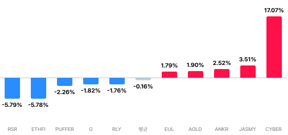 프리미엄 구간 EUL(+1.79%)|AGLD(+1.90%)|ANKR(+2.52%)|JASMY(+3.51%)|CYBER(+17.07%)