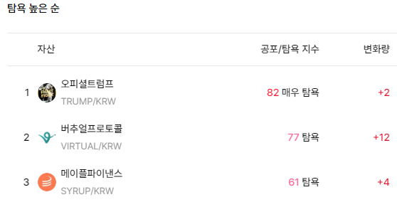 오피셜트럼프(TRUMP)가 31일 오후 업비트에서 10,445원(USDT 기준 6.93달러)에 거래되며 하루 새 17% 급락했다. 전일 급등 이후 차익 매물이 쏟아지면서 단기 조정세를 보이고 있으나, 업비트 공포·탐욕 지수에서는 여전히 82포인트로 ‘매우 탐욕’ 구간을 유지하며 전체 자산 중 1위를 기록했다. 매도세 속에서도 투자심리 과열이 이어지는 모습이다.