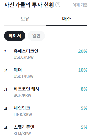 자산가들이 30일 오전 10시 59분 기준 가장 많이 매수한 암호화폐는 유에스디코인(USDC), 테더(USDT), 비트코인 캐시(BCH), 체인링크(LINK), 스텔라루멘(XLM) 순으로 집계됐다.