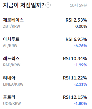 한편, 빗썸의 상대강도지수(RSI)에 따르면 제로베이스(ZBT)는 RSI 2.53%(±0.00%)로 가장 낮은 수준을 기록했다. 아치루트(AL)는 6.95%(-6.76%), 래드웍스(RAD)는 10.34%(-1.99%), 리네아(LINEA)는 11.22%(-2.31%), 울트라(UOS)는 12.15%(-1.80%)로 나타났다.