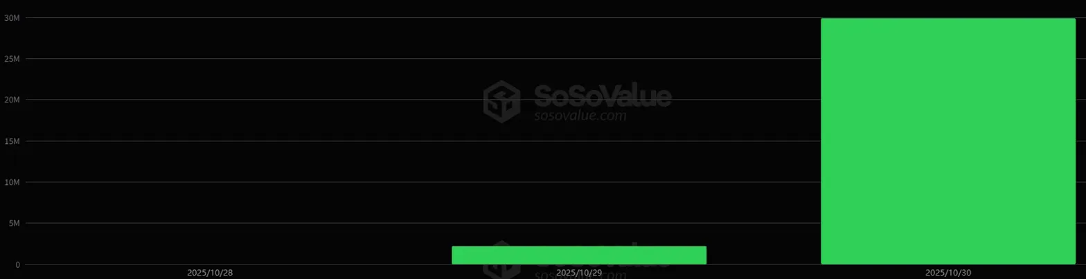 소소밸류 집계에 따르면 30일(현지시간) 미국 솔라나 현물 ETF 시장에서는 총 3733만 달러(약 533억원) 규모의 순유입이 발생했다.