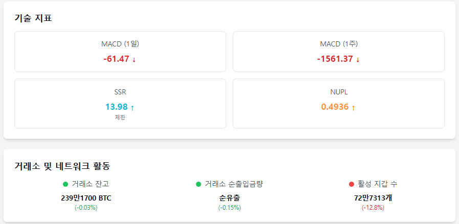 거래소 보유량 239만1700 BTC(–0.03%) 거래소 내 보유량은 전일 대비 소폭 감소했다. 매도 압력이 다소 완화되며 일부 장기 보유세가 유지되고 있다.