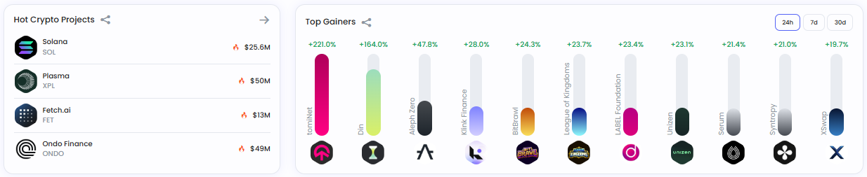 주요 인기 프로젝트는 ▲솔라나(SOL, 2560만 달러) ▲플라즈마(XPL, 5000만 달러) ▲페치.ai(FET, 1300만 달러) ▲온도파이낸스(ONDO, 4900만 달러) 순으로 확인됐다.