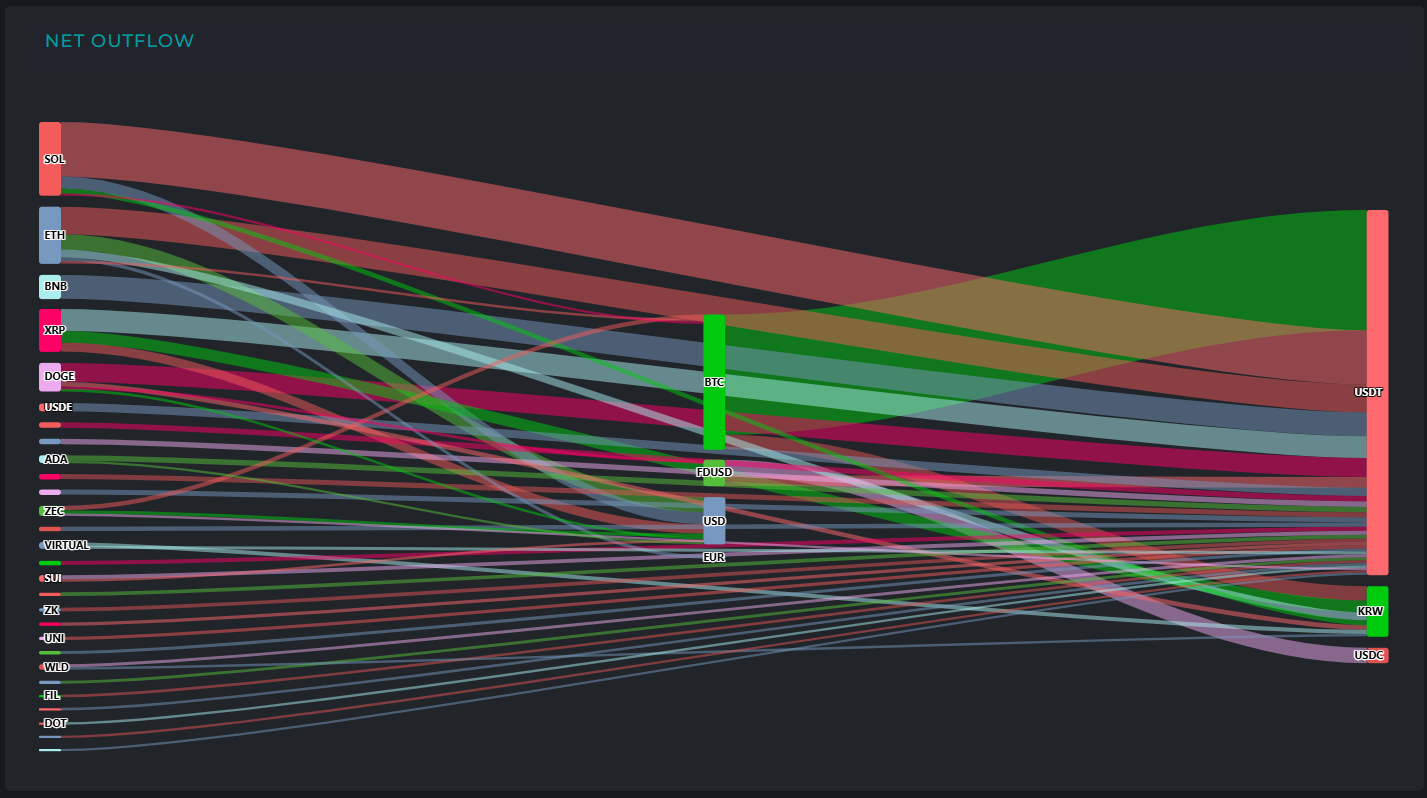 도지코인(DOGE)에서는 4450만 달러가 유출되며 ▲USDT(2880만 달러) ▲원화(710만 달러) ▲FDUSD(460만 달러) ▲USD(390만 달러)로 이동했다.