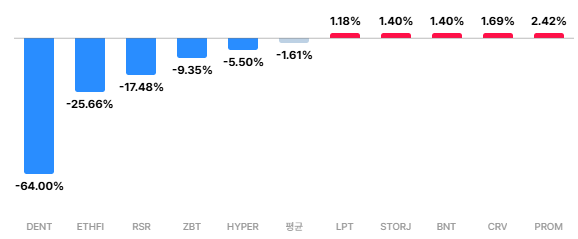 역프리미엄 구간 DENT(–64.00%)|ETHFI(–25.66%)|RSR(–17.48%)|ZBT(–9.35%)|HYPER(–5.50%)
