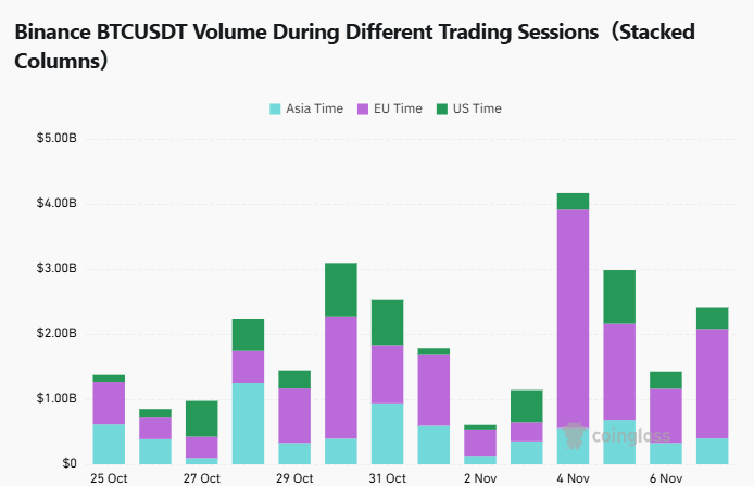 바이낸스 BTCUSDT 거래량은 아시아 시간대 3억9802만 달러, 유럽 시간대 16억8000만 달러, 미국 시간대 3억2919만 달러로 집계됐다.