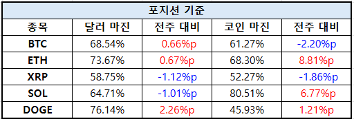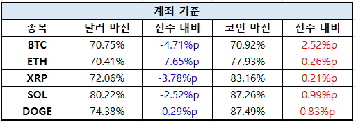 솔라나는 달러 마진 64.71%(–1.01%p), 코인 마진 80.51%(+6.77%p)로 달러 마진에서는 약세를 보였으나 코인 마진에서는 매수세가 두드러졌다. 도지코인은 달러 마진 76.14%(+2.26%p), 코인 마진 45.93%(+1.21%p)로, 전주 대비 상승세를 유지했다.