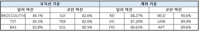상위 트레이더 기준 종목별 포지션 비중을 보면, 포지션 기준 달러 마진 시장에서는 ▲BROCCOLI714(86.1%) ▲TST(85.5%) ▲BAS(83.8%) 순으로 롱 포지션 비중이 높았다.