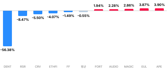 역프리미엄 구간 DENT(–56.38%)|RSR(–8.47%)|CRV(–5.50%)|ETHFI(–4.07%)|FF(–1.49%)