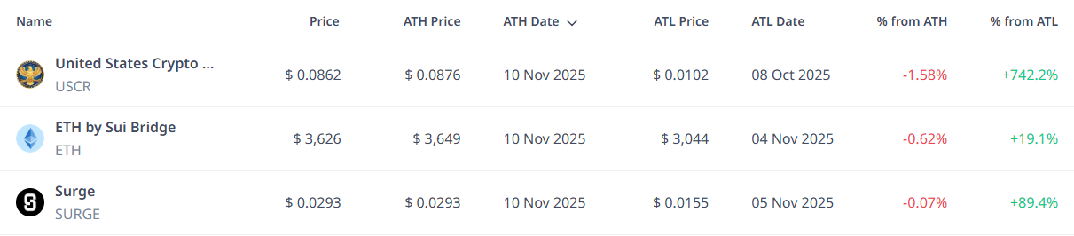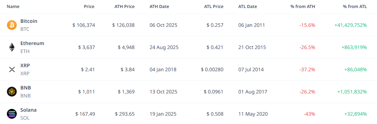 [편집자주] 암호화폐 시장은 하루 새 고점과 저점이 빠르게 바뀌는 고변동성 환경이다. 역대 최고가(ATH)와 역대 최저가(ATL) 경신 종목을 추적하면 강세와 약세 흐름을 조기에 포착할 수 있다. 크립토랭크 기준 시가총액 1000만 달러 이상 종목 중 하루 사이 고점 또는 저점을 경신한 주요 토큰을 정리하고 시가총액 상위 종목과 실시간 국내 인기 자산의 고점 대비 조정률을 함께 분석해 시장 회복 여력과 흐름을 진단한다.