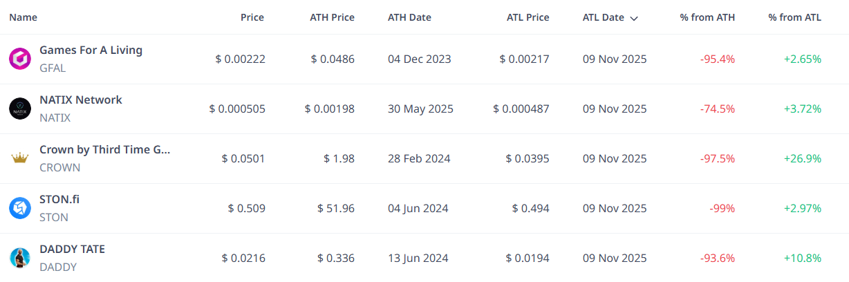 이날 시가총액 1000만 달러 이상 종목 중 신저점을 경신한 암호화폐는 없었다. 전날에는 위 5개 종목을 포함해 13개 종목이 신저점을 기록했었다. 상위 5개 종목은 모두 최근 저점 대비 소폭 상승세를 보이며 반등 흐름을 이어갔다. 특히 크라운(CROWN)은 26.9%의 상승률로 두드러진 회복세를 나타냈고 나틱스네트워크(NATIX)와 스톤파이(STON) 역시 완만한 반등세를 이어가며 시장 저점 매수세를 확인시켰다.