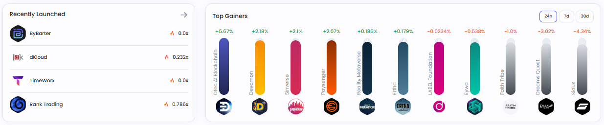 최근 해당 플랫폼에서 출시된 프로젝트는 ▲바이바터(0.0배) ▲디클라우드(0.23배) ▲타임웍스(0.0배) ▲랭크트레이딩(0.78배)으로 확인됐다.