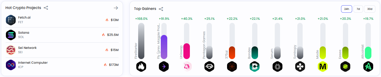 상승률 상위 프로젝트는 ▲파이어스타터(+168.0%) ▲플라이(+91.9%) ▲유니스왑(+40.3%) ▲펜타곤게임즈(+25.1%) ▲써티파이(+22.2%) ▲본덱스(+22.1%) ▲세럼(+21.4%) ▲신트로피(+21.0%) ▲모드(+21.0%) ▲에스씨(+20.3%) ▲알케미스트(+19.7%) 순으로 확인됐다.