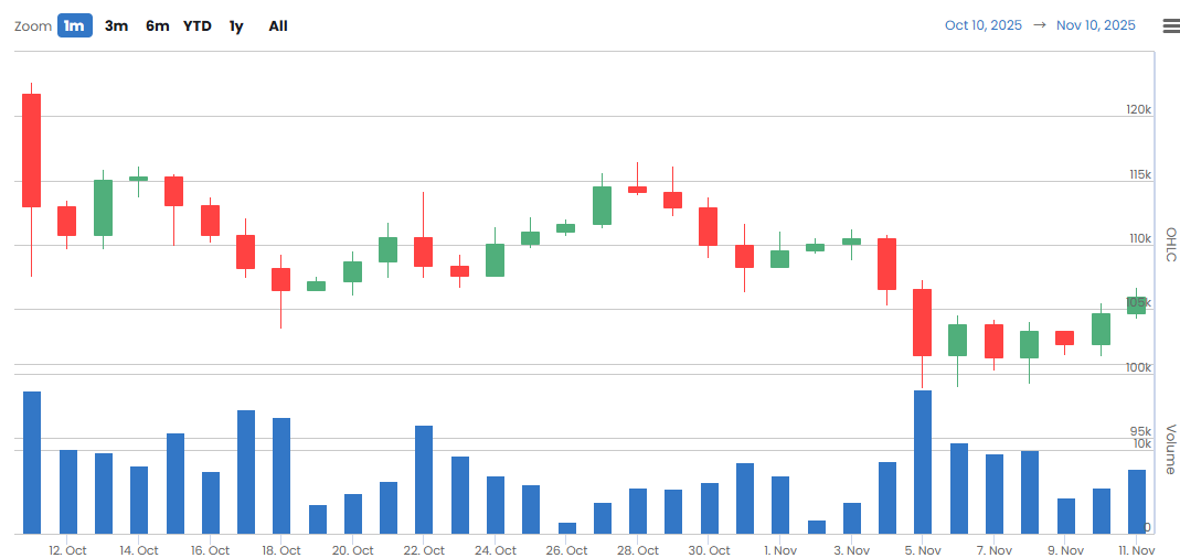 코이니지(Coinigy)에 따르면 코인베이스 프라임의 비트코인 거래량은 11월 10일 기준 약 7737BTC로 집계됐다. 직전 9일 기록한 5548BTC 대비 약 39.5% 증가하며 거래 활동이 뚜렷한 회복세를 보였다. 달러 기준 24시간 거래량은 약 5억6000만 달러 수준으로 추정된다.