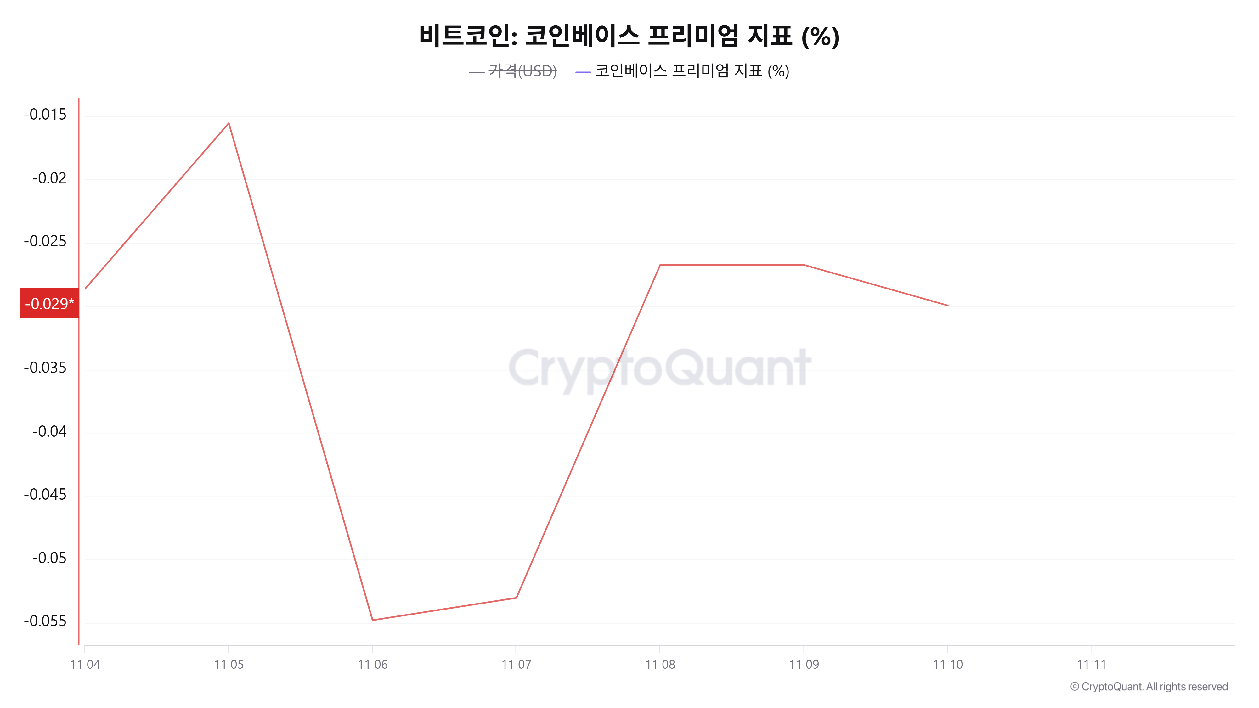 코인베이스 프리미엄 지표는 10일 기준 –0.029%로, 전일(–0.026%) 대비 마이너스 폭이 다소 확대되며 미국 현물 시장의 매도 압력이 재차 강화되는 모습을 보였다.